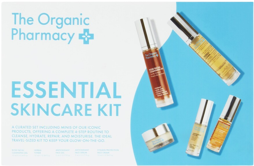 Das Essential Skincare Kit von The Organic Pharmacy ist ein fünf-teiliges Set, das eine vollständige 4-Schritte-Routine zum Reinigen, Hydratisieren, Reparieren und Befeuchten bietet. Das Kit beinhaltet Produkte in Reisegröße, welche unterwegs stets für einen strahlenden, gepflegten Teint sorgen.